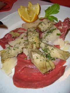 生の薄切り肉にパルメザン・チーズの薄切りを乗せ、オリーブ油をかけて食べる。